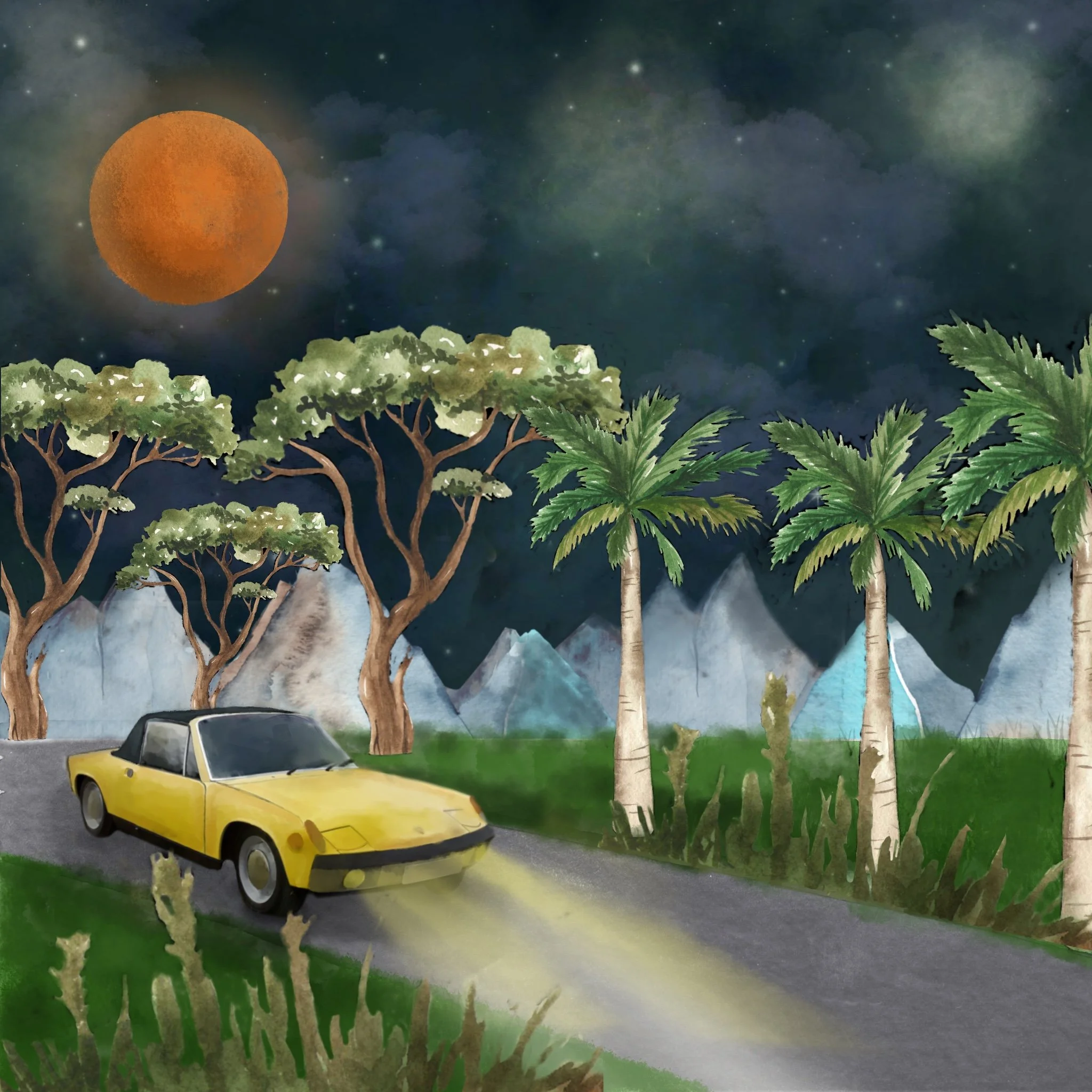 He searched for an artist who would be interested in creating water color art. After a short time, he found an artist in India through a company called Freelancer and became connected with Tejal. She was wiling to give this a try. In the featured poem below he challenged her to capture the feeling of driving in a sports car on a full moon night and she nailed it!